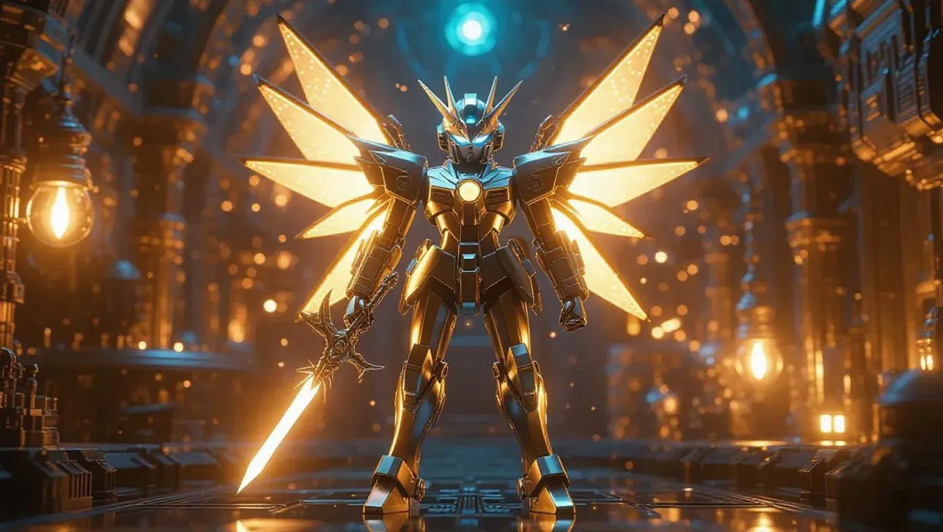 A high-gloss gold and silver robotic Sailor Lumina mech figure with crescent moon wings and a light-launching wand stands prominently. The packaging is adorned with light-themed designs and crescent moon-shaped holographic labels, featuring bonus gear arms. The background showcases a magical toy factory filled with floating mechanical lights and a whimsical, celestial atmosphere. Soft, warm light casts gentle highlights, enhancing the figure’s glossy finish. Style: Cute and futuristic with a touch of cyberpunk flair.