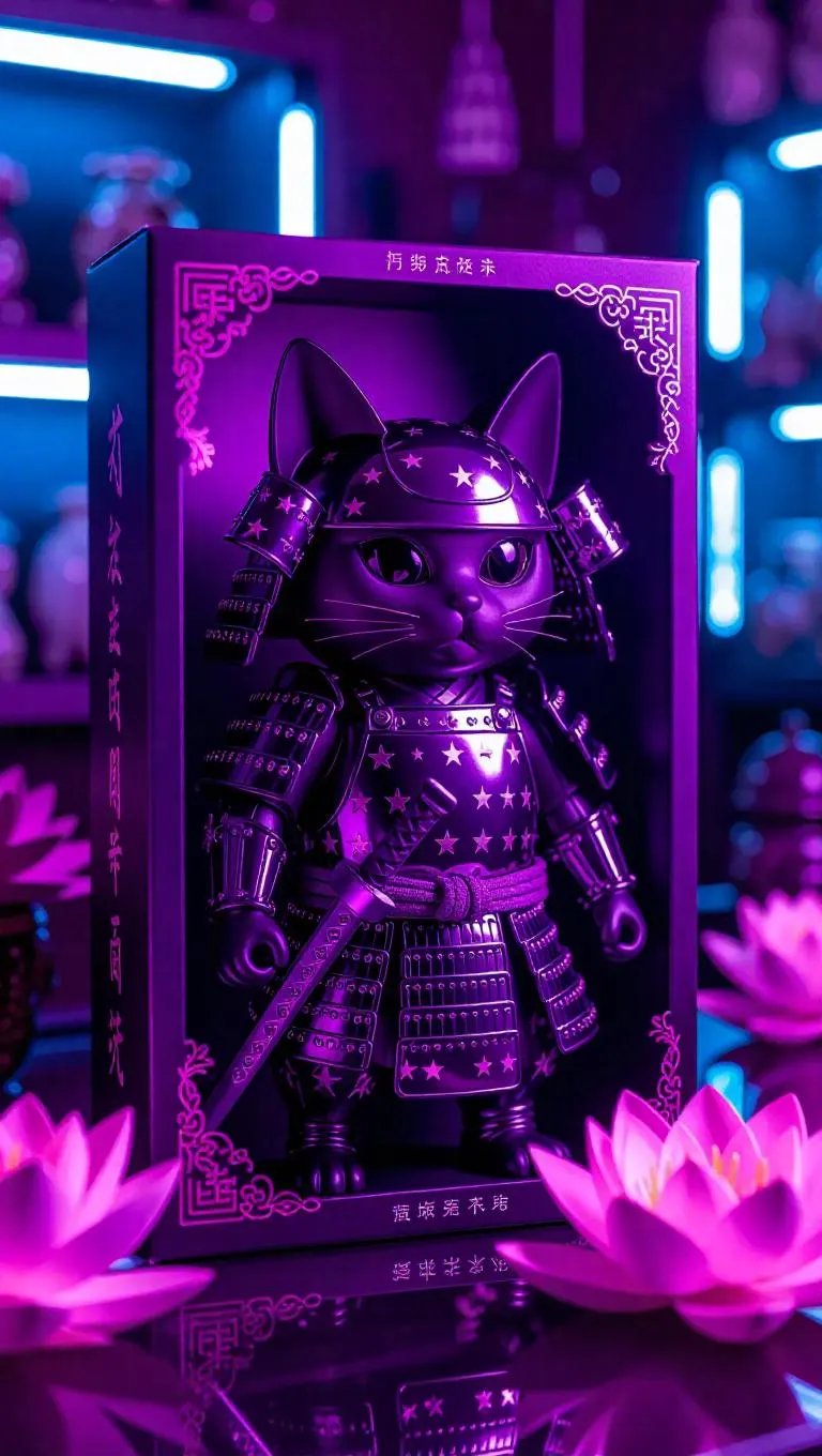 A samurai cat warrior toy clad in lacquered purple armor adorned with star patterns and triple blade tails. The box features lotus flowers, Japanese kanji stamps, and a velvet pouch. Set against a futuristic workshop with neon-lit toy shelves, the scene is illuminated by soft, ethereal light, casting dreamy shadows that enhance the toy's detailed craftsmanship. Style: Realistic.