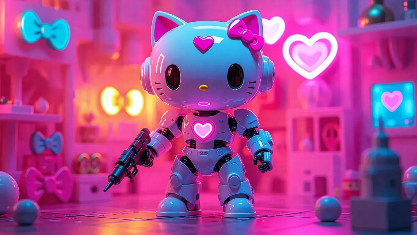 A high-gloss white and pink robotic Hello Kitty mech figure with jetpack ears and a missile-launching bow stands prominently. The figure's packaging is adorned with bubble-themed designs and heart-shaped holographic labels, including bonus gear arms. The background showcases a pastel-colored toy factory, filled with floating mechanical bows and a whimsical, vibrant atmosphere. Soft, warm light casts gentle highlights on the figure, enhancing its glossy finish. The style is a blend of cute and futuristic, with a touch of cyberpunk flair.