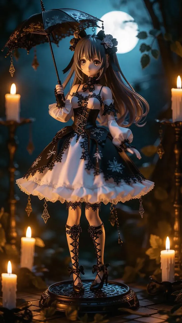 A gothic lolita action figure, ethereal and charming, dressed in a lavish dress adorned with intricate leaf and vine motifs. Wields a parasol that transforms into a healing staff. Toy box showcases a hauntingly beautiful glade surrounded by soft moonlight. Background: A shadowy forest with flickering candles casting magical shadows.