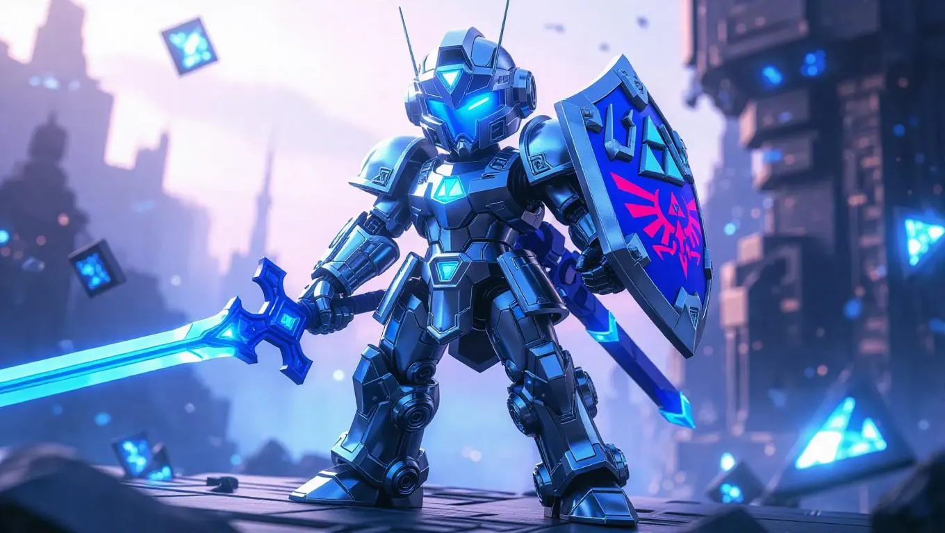 A high-gloss silver and blue robotic Link mech figure with Master Sword, shield, and Triforce-launching bow stands prominently. The packaging features tech-themed designs and shield-shaped holographic labels, including bonus gear arms. The background is a cybernetic landscape with floating mechanical arrows, mystical lights, and an adventurous atmosphere. Soft, icy light enhances the figure's glossy finish, blending cute and futuristic aesthetics with a chilly atmosphere.