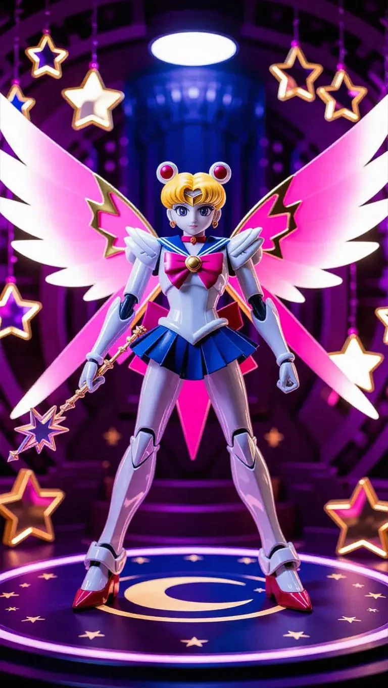 A high-gloss white and pink robotic Sailor Moon mech figure with crescent moon wings and a star-launching wand stands prominently. The packaging is adorned with star-themed designs and crescent moon-shaped holographic labels, featuring bonus gear arms. The background showcases a magical toy factory filled with floating mechanical stars and a whimsical, celestial atmosphere. Soft, warm light casts gentle highlights, enhancing the figure’s glossy finish. Style: Cute and futuristic with a touch of cyberpunk flair.