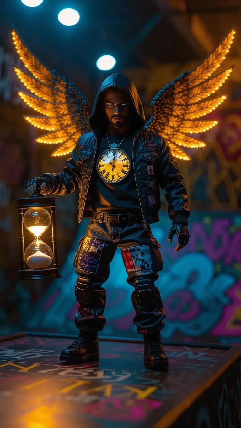 A time traveler action figure with intricate clock-shaped wings and an hourglass staff glowing with radiant golden light. Wears a casual streetwear outfit adorned with patchwork designs. The toy box showcases a skate park theme. Background: An energetic skate park filled with skaters, ramps, and graffiti. Style: Action-packed.