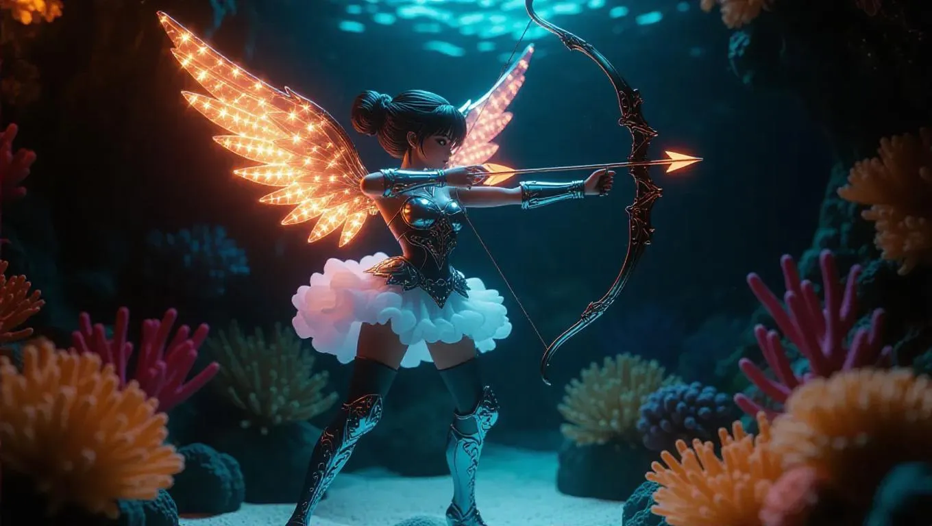 A celestial archer action figure with radiant star-shaped wings and a bow emitting cosmic energy, clad in an outfit adorned with whimsical clouds. Toy box features a soft, pastel cosmic design. Background: An underwater realm with luminous corals and gentle sea creatures. Style: Hyper-realistic with an underwater fantasy twist.