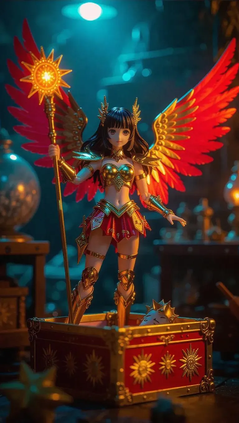 A magical girl action figure with fiery red wings, a golden staff, and radiant eyes stands in a victorious pose. Her toy box is embellished with glittering suns and features her in an empowered magical stance, complete with additional flare accessories. The background is a mystical toy workshop, bathed in dramatic, shadowy light that accentuates the vibrant hues and creates a magical ambiance. Style: Realistic with elements of magic.