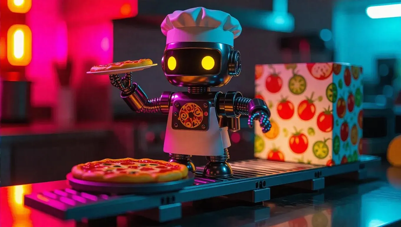 A toy robot chef with griddle arms, a pizza-launching backpack, and a chili sauce sprayer. The robot has a shiny, metallic body with whimsical, exaggerated features. It stands on a kitchen-style toy conveyor belt system with sizzling effects, surrounded by retro cafe designs and a holographic veggie pattern on the packaging. Bright, cheerful lighting highlights the robot’s vibrant colors and the dynamic action of the conveyor belt, creating a lively and delightful atmosphere. Style: Retro-futuristic.