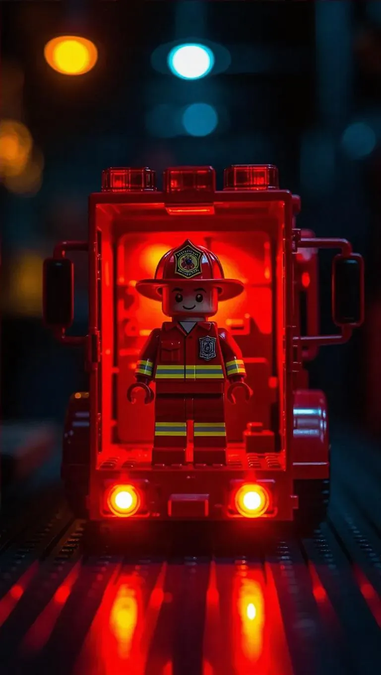 A dilapidated toy firefighter with red accents stands on a fire truck platform inside his emergency-themed packaging. The box features a removable badge sticker. In a dimly lit rescue toy factory, orange-red lights create flickering reflections, enhancing the urgent, action-filled atmosphere. Realistic firefighting aesthetics.