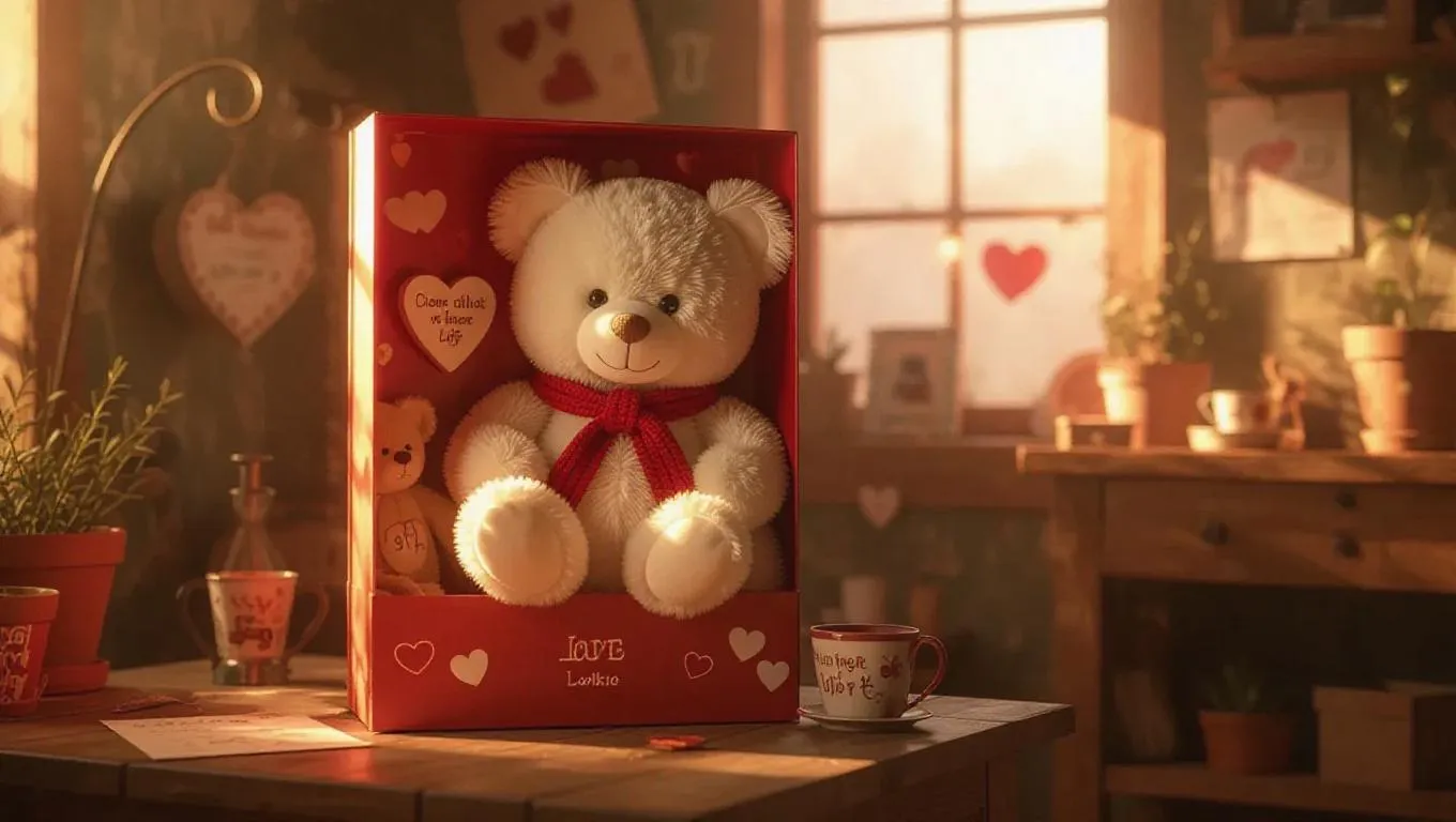 A plush teddy bear with cozy fur and a red scarf leans on a heart-shaped rotating platform within its packaging. The box features a love-themed design and a fold-out story card. Soft, blush light seeps through wide windows in a cozy toy workshop, creating a warm and inviting atmosphere. Adorable style mixes realism with heartfelt fantasy.