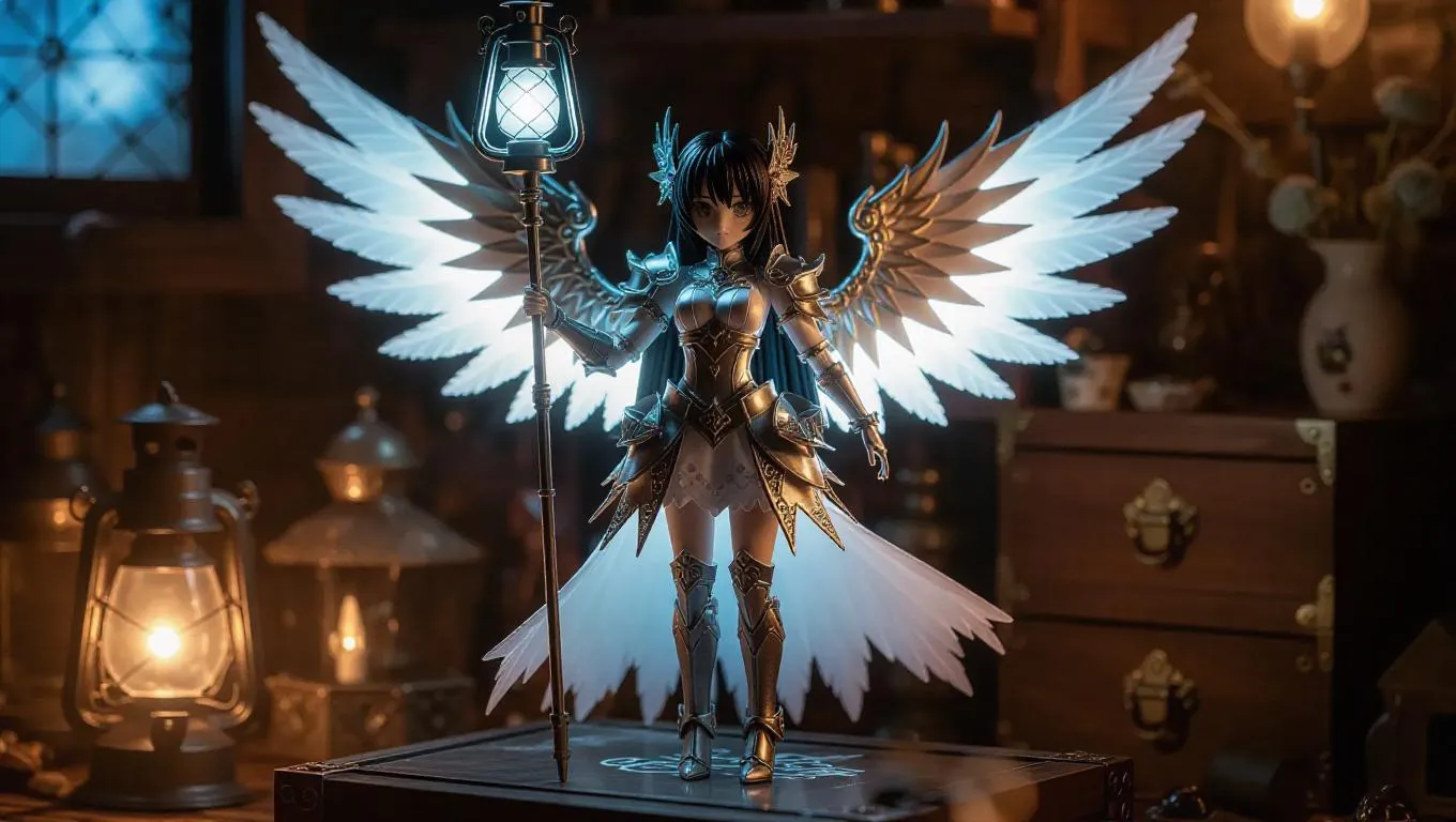 A magical girl action figure with elegant silver wings, a lantern staff, and radiant eyes stands in a mysterious pose. Her toy box is adorned with ethereal shadows and features her in an enchanting magical stance, complete with bonus glow-in-the-dark accessories. The background is a mystical toy workshop, softly lit by moonlight that brings out the depth of colors and creates an air of mystery. Style: Realistic with an enchanting vibe.