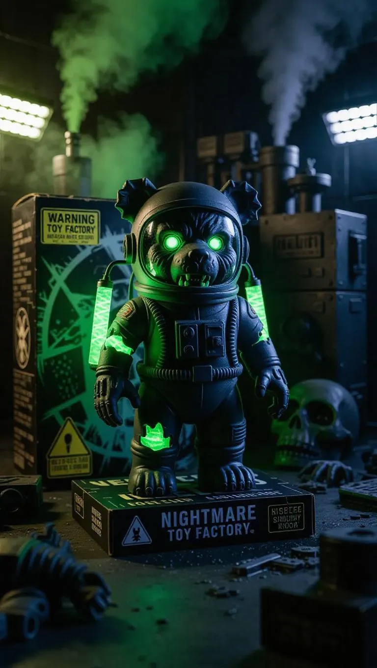 A limited-edition zombie astronaut bear toy stands out with patched limbs, glowing green ooze tubes, and a shattered glass helmet. The box features glow-in-the-dark warning labels and "Nightmare Toy Factory" branding, complete with strange accessory pieces. In the background, the factory leaks green fumes and casts ghostly lights, creating a hauntingly surreal atmosphere. The scene is bathed in a mix of hard, green-tinted light and soft, smoky shadows, enhancing the dystopian vibe. Style: Dark, futuristic realism.