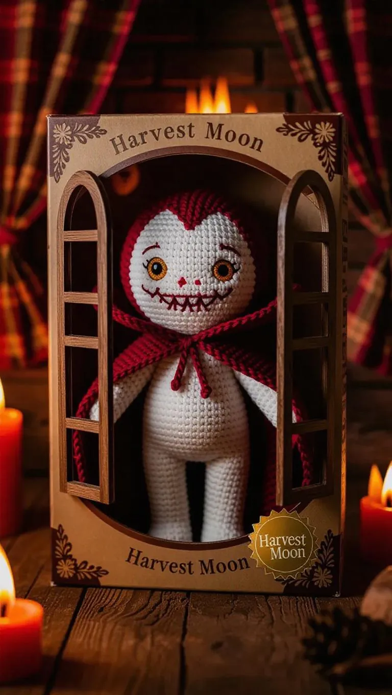 A cozy vampire doll, a rustic collector toy, features a knitted cape, fanged grin, and warm amber eyes. The doll is displayed in a box with wooden-trimmed windows, chestnut patterns, and a “Harvest Moon” foil seal. Set against a background of a charming yet spooky cabin, complete with flickering hearth flames and plaid curtains. Warm, golden light casts inviting shadows, enhancing the doll’s homey charm. Style: Cozy fantasy.