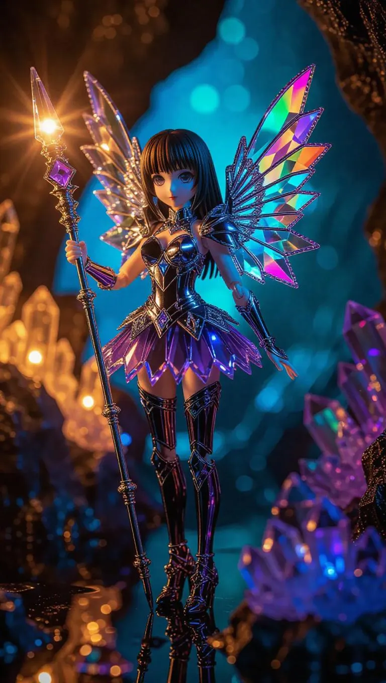 A magical girl action figure with luminous crystal wings that refract light into rainbows, wielding a magic staff that glows with prism energy when activated. Her eyes sparkle with gem-shaped glimmers, and her outfit is diamond and crystal themed. The toy box is embellished with crystalline patterns, set against a backdrop of a sparkling cavern filled with glowing gemstones. Style: Realistic with a crystalline fantasy vibe.