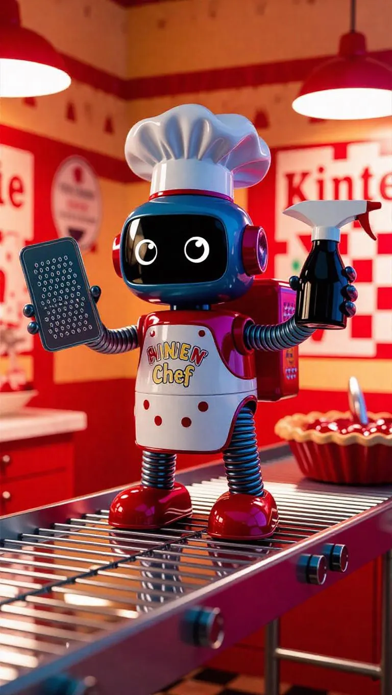 A toy robot chef with grater arms, a cake-launching backpack, and a balsamic vinegar sprayer. The robot has a shiny, metallic body with comical, exaggerated features. It stands on a kitchen-style toy conveyor belt system with roasting effects, surrounded by nostalgic diner designs and a glittering cherry pie pattern on the packaging. Warm, inviting lighting highlights the robot’s vibrant colors and the dynamic action of the conveyor belt, creating a friendly and cheerful atmosphere. Style: Retro-futuristic.