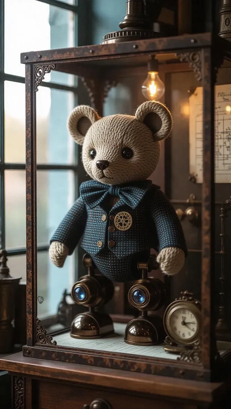 A steampunk teddy bear toy designed from reclaimed metal, tweed fabric, and jewel-toned eyes, featuring a winding key on its back. It stands in a display case with ornate textures, a faux-canvas label, and a sleek glass window frame. The scene is set inside a vintage toy workshop, surrounded by blueprints and gadgets. Soft, bright light filters through the windows, casting playful shadows and drawing attention to the unique details of the bear and the workshop. The style is realistic, highlighting the tactile and mechanical elements.