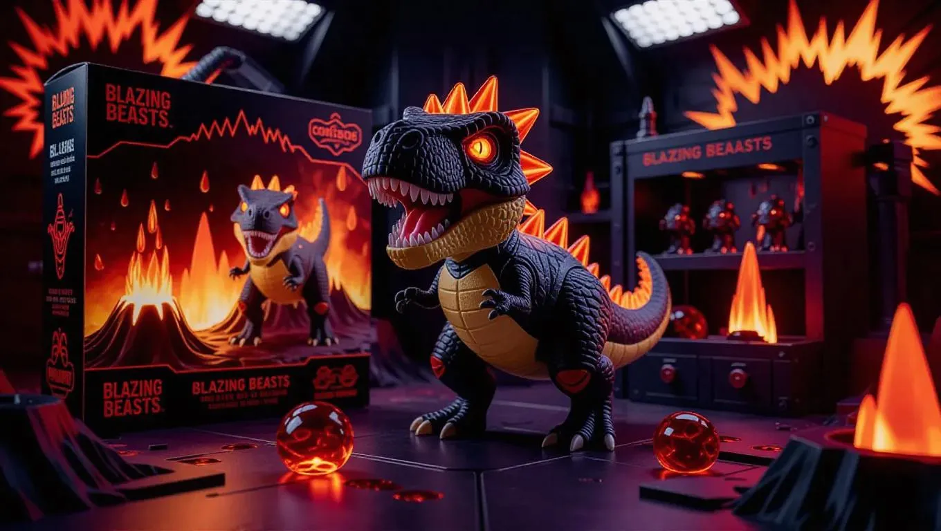 A chibi dinosaur toy in lava armor with translucent fire spikes and glowing red eyes, posed in a ferocious stance. The toy box features erupting volcano graphics and "Blazing Beasts" branding, including a collectible magma pearl. Set in a laboratory with an active production line, molten segments, and bright openings, the scene is illuminated by sharp, fiery light casting fierce shadows. Style: electricity and action, with a strong vibe.