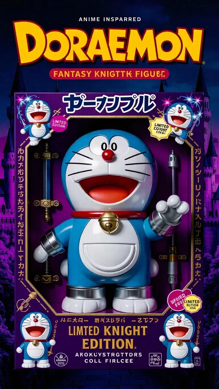An anime-inspired collectible action figure of Doraemon in a fantasy knight design, packaged inside a premium toy box. Doraemon has a sleek, robotic redesign with shiny metallic silver armor, glowing blue eyes, and mechanical gauntlets. His signature round body is now detailed with tech panels and energy cores, and his iconic bell and pouch are upgraded with medieval elements. The packaging features bold Japanese anime-style fonts, cel-shaded illustrations of Doraemon in action poses, and a holographic “Limited Knight Edition” sticker. The box includes accessory parts like a sword arm and a shield tool. Background features a mystical castle skyline at dawn. Style: anime-knight, cel-shaded, high detail, collectible figure with toybox glare and dramatic lighting.