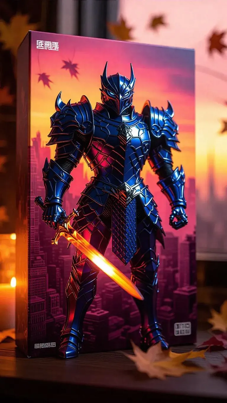 A regal hawk warrior toy, clad in vibrant blue and silver armor with intricate dragon scale patterns, wielding a blazing sword. The box showcases a sunset over a modern skyscraper, surrounded by falling leaves and adorned with artistic graffiti. Includes a velvet pouch for accessories. Set in a bustling city workshop with candles and contemporary art, bathed in soft pink light, highlighting the toy's majestic and realistic design.