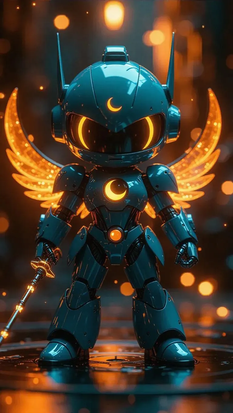A high-gloss teal and orange robotic Sailor Ember mech figure with crescent moon wings and a fire-launching wand stands prominently. The packaging is adorned with ember-themed designs and crescent moon-shaped holographic labels, featuring bonus gear arms. The background showcases a magical toy factory filled with floating mechanical embers and a whimsical, celestial atmosphere. Soft, warm light casts gentle highlights, enhancing the figure’s glossy finish. Style: Cute and futuristic with a touch of cyberpunk flair.