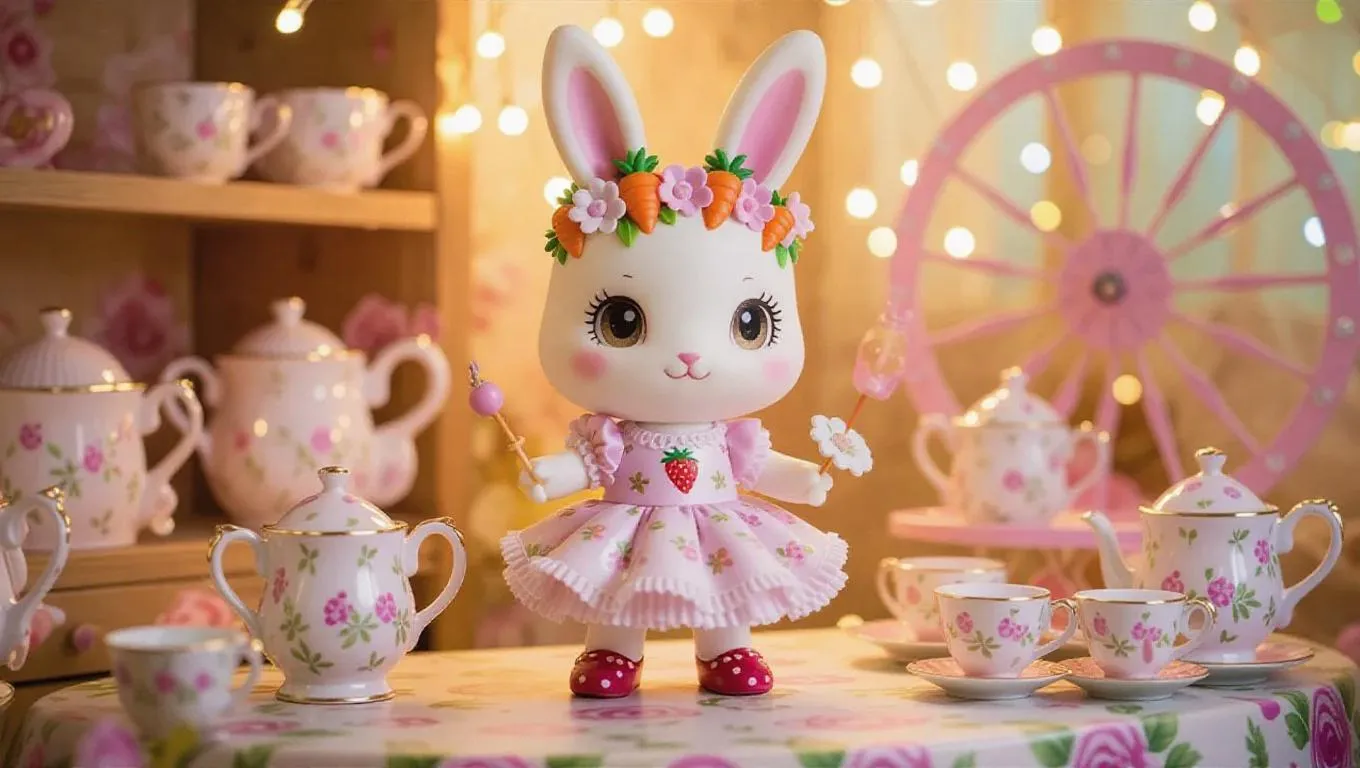 A candy-coated bunny action figure dressed as a woodland tea party host, featuring carrot-topped ears, a frilly strawberry-print dress, and mushroom-cap shoes. The toy box is adorned with watercolor-style floral patterns and shimmering iridescent polka dots, complete with miniature tea set accessories. The backdrop showcases a whimsical toy workshop filled with floating teacups and pastel-colored spinning wheels crafting flower-shaped toys, bathed in warm, golden light with a sprinkle of glitter. Style: Chibi anime with enchanting, pastoral charm.