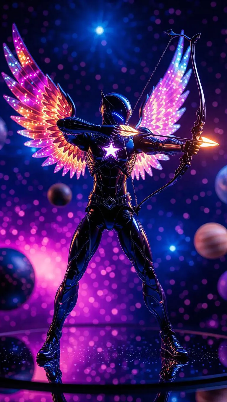 A celestial archer action figure with radiant star-shaped wings and a bow emitting cosmic energy, clad in an outfit adorned with intricate constellations. Toy box features a holographic starry sky design. Background: A cosmic workshop with floating planets and swirling nebulae. Style: Hyper-realistic with a celestial fantasy twist.