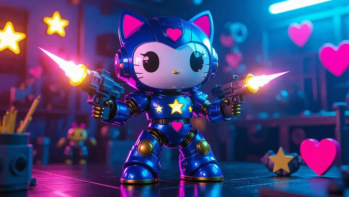 A gleaming blue and yellow robotic Hello Kitty mech figure with jetpack ears and a laser-firing bow stands prominently. The figure's packaging is decorated with star-themed designs and diamond-shaped holographic labels, including extra bonus gear limbs. The background features a colorful toy workshop, filled with hovering mechanical hearts and a playful, energetic atmosphere. Bright, cool light casts sharp highlights on the figure, emphasizing its glossy finish. The style is a mix of adorable and modern, with a hint of steampunk aesthetics.