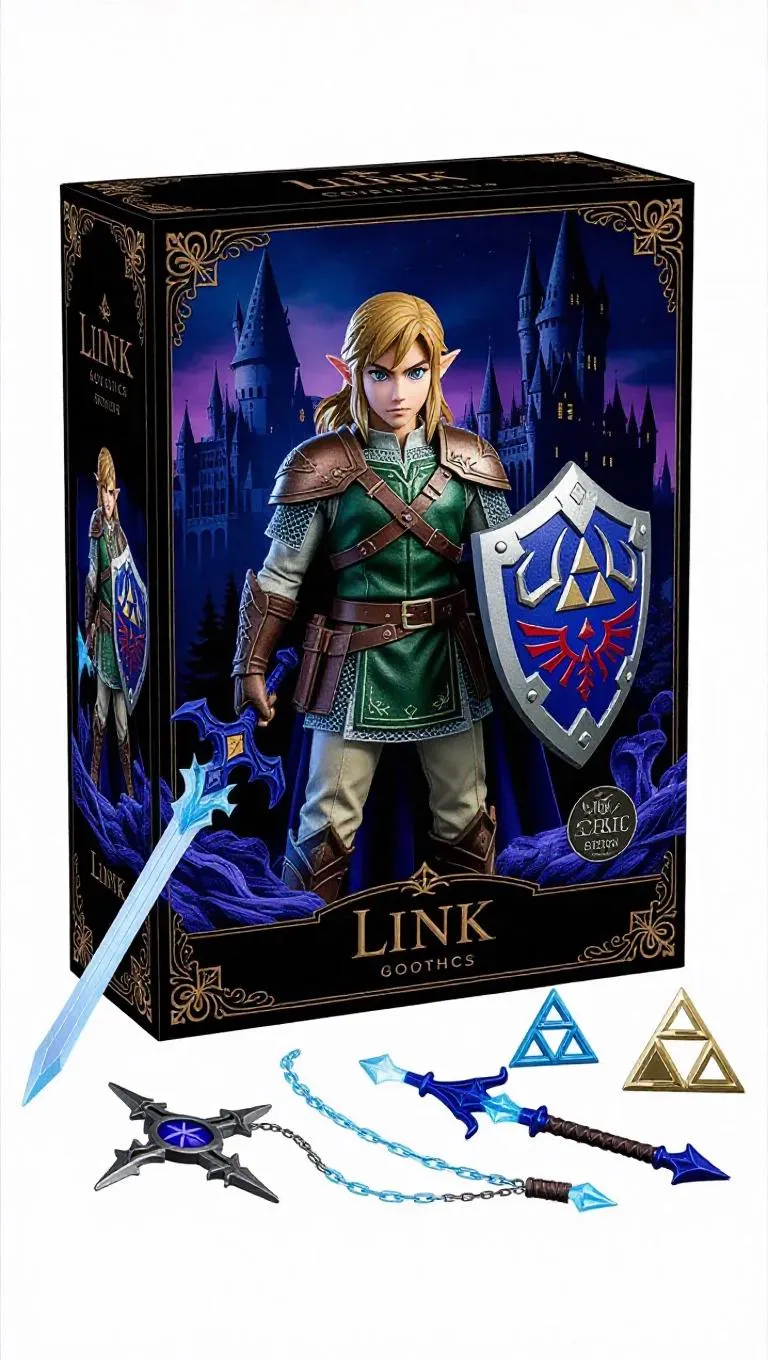 A gothic-inspired collectible action figure of Link, encased in a dark, ornate toy box. Link's gothic redesign features darkened bronze armor, glowing cyan eyes, and leather accents. His Master Sword is adorned with dark runes and icy blue energy cores, while his shield is enhanced with intricate celestial motifs. The packaging showcases elegant, gothic-style fonts, dark illustrations of Link in heroic poses, and a holographic 'Limited Gothic Edition' sticker. Included accessories: Triforce launcher, spectral whip. Background: shadowy Hyrule Castle, mystical valley, starry night. Style: gothic, high detail, dramatic lighting, warm tones.