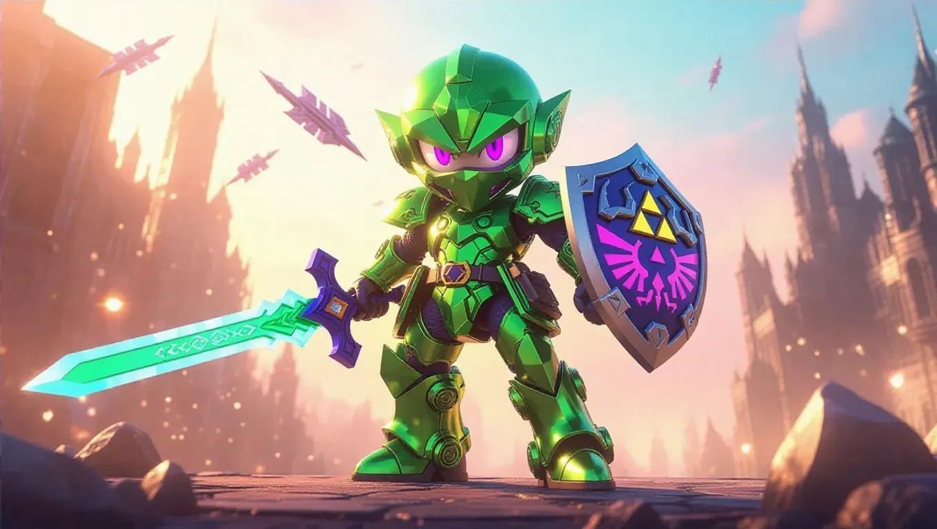 A high-gloss green and lavender robotic Link mech figure with Master Sword, shield, and Triforce-launching bow stands prominently. The packaging features dream-themed designs and shield-shaped holographic labels, including bonus gear arms. The background is a surreal landscape with floating mechanical arrows, mystical lights, and an adventurous atmosphere. Soft, dreamy light enhances the figure's glossy finish, blending cute and futuristic aesthetics with an imaginative flair.