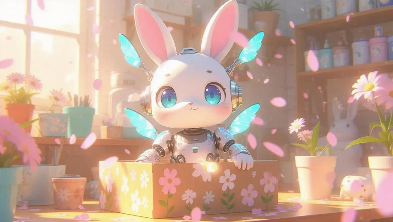 An anime-styled robot bunny with propeller ears, a jetpack tail, and holographic eyes stands in a spring-themed box adorned with flower explosions, glowing stickers, and pastel decals. The background features a bunny-themed toy assembly line, with floating flower petals adding a whimsical touch. Soft, warm light enhances the pastel colors, creating a cheerful and vibrant atmosphere. The style is playful and cartoonish, with clean lines and exaggerated features.