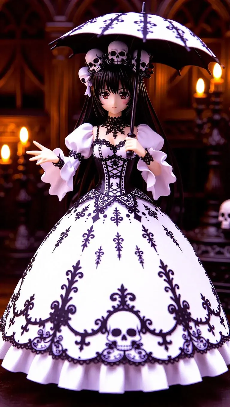 A gothic lolita action figure, dark and elegant, dressed in a lavish dress adorned with intricate skull and bone motifs. Wields a parasol that transforms into a formidable weapon. Toy box showcases a hauntingly beautiful mansion surrounded by twisted, gnarled trees. Background: A shadowy workshop with flickering candles casting eerie shadows.