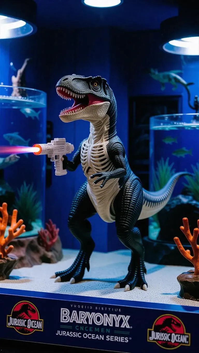 A high-tech Baryonyx figure with aquatic feet and an aquatic laser gun stands vigilant in a dino-themed aquarium. The packaging features cool dinosaur skeleton overlays, water warnings, and "Jurassic Ocean Series" branding. Fish tanks and coral sculptures fill the background, under blue, ambient aquarium lighting. The atmosphere merges marine life with prehistoric wonder, showcasing the intricate features of the figure within the unique setting.
