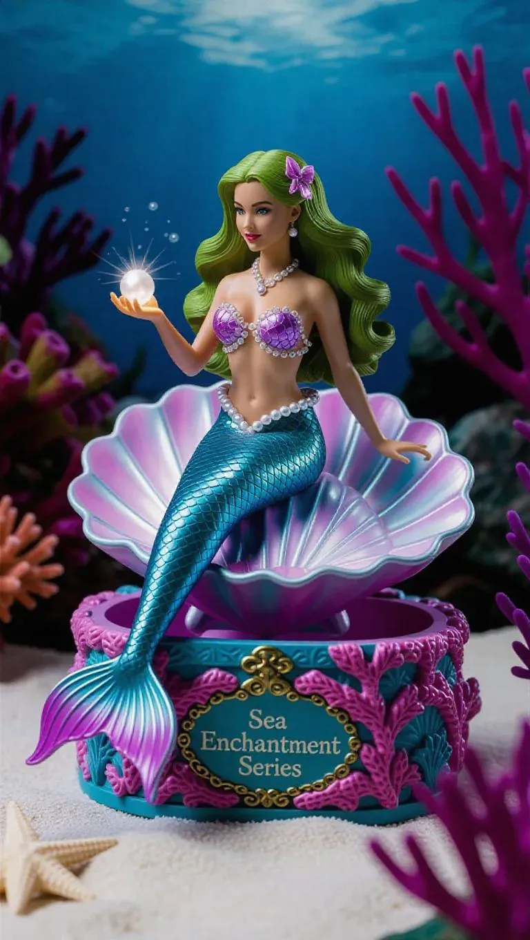 A highly detailed figure of a mermaid enchantress, her long, flowing chartreuse hair cascading over her shapely form. Seated on a large, iridescent seashell, her fishtail curls gracefully around her. Pearl-encrusted netting adorns her top, and her tail shimmers with scales in shades of pink and turquoise. Holding a glowing pearl, emitting a soft, otherworldly light. The toy box resembles an underwater treasure chest, textured like coral and seashells, with "Sea Enchantment Series" emblazoned on the front. Tranquil reef background, teeming with serene seahorses and colorful corals. Gentle, filtered dawn light creates a dreamy, ethereal glow, enhancing the magical and tranquil elements.
