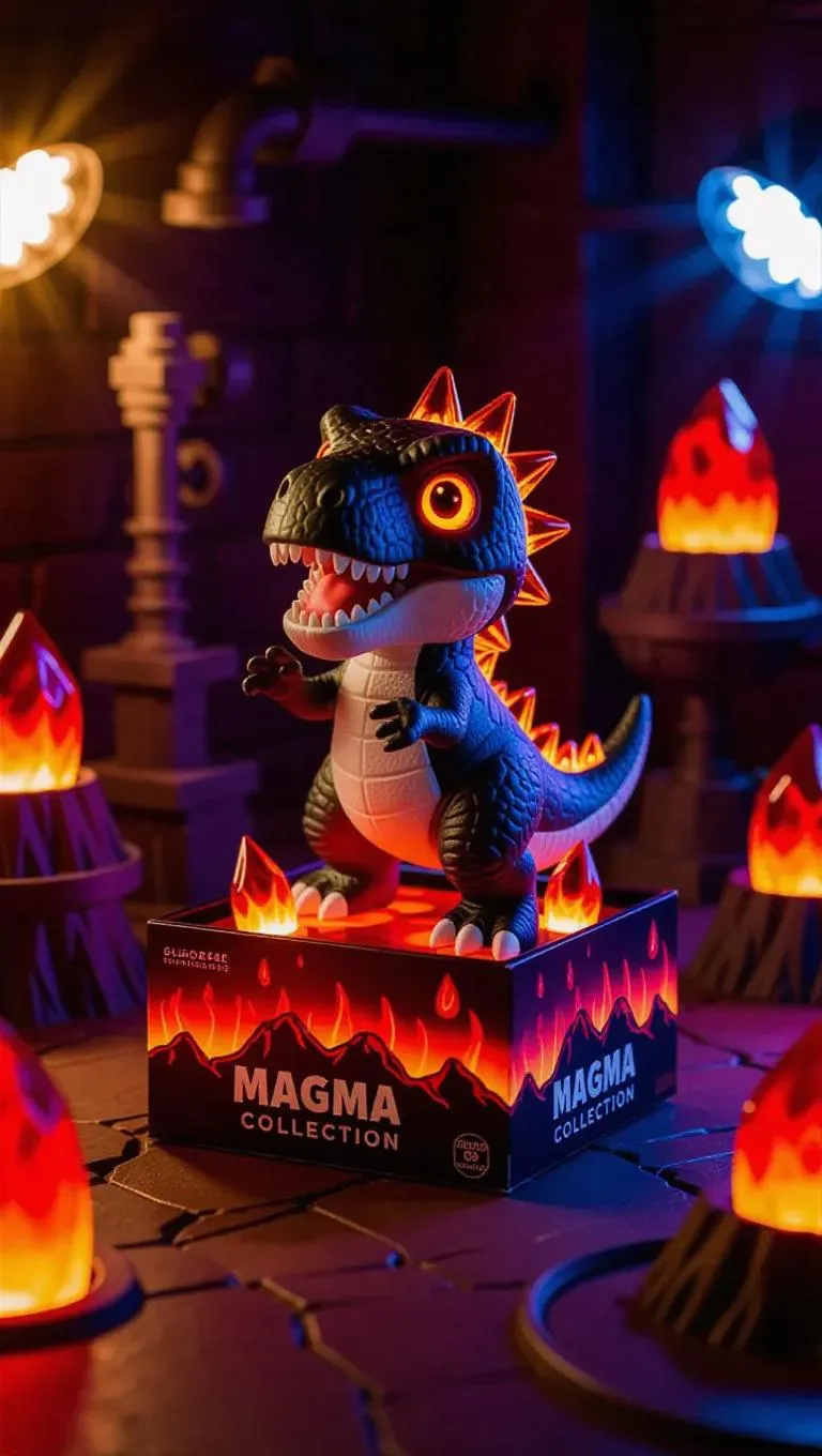 A chibi dinosaur toy in lava armor with translucent fire spikes and glowing red eyes, posed in a celebratory pose. The toy box features erupting volcano graphics and "Magma Collection" branding, including a collectible lava crystal. Set in a workshop with a magma-fueled backdrop, glowing machinery, and flickering seams, the scene is illuminated by dazzling, colorful light casting lively shadows. Style: cheerful and jubilant, with an essence of festivity.