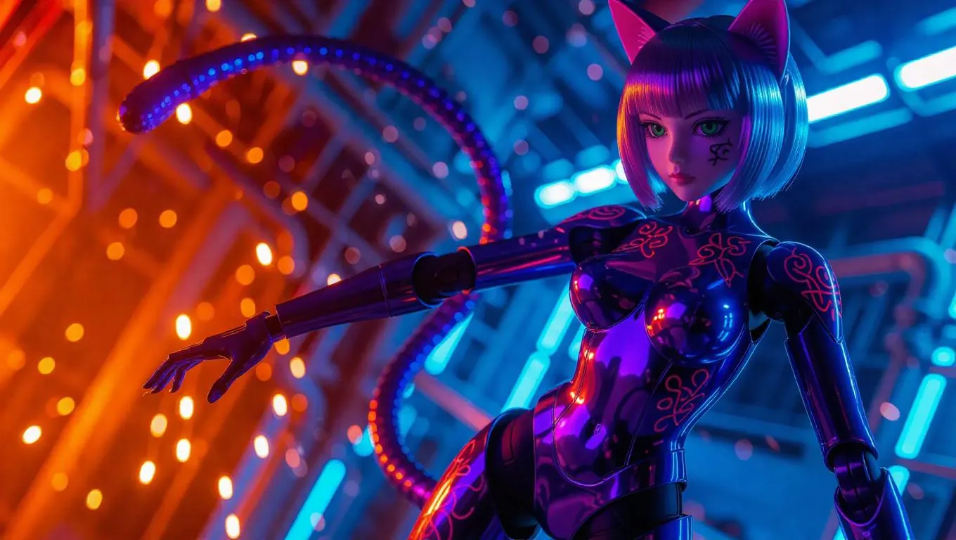A futuristic catgirl action figure, with a multifaceted tail whip and a reflective violet bodysuit, features bright orange tattoos on her thighs. Her medium-length silver hair and vibrant green eyes lend her a unique character. The packaging glows with vibrant indigo neon patterns and has magnetic snapping panels. Set against an exhilarating toy factory backdrop, with sparks, transforming drones, and energy pathways embedded in the structure. Lighting is vivid and intense, casting sharp shadows and eye-catching highlights. Style: Sci-Fi, Cyberpunk.