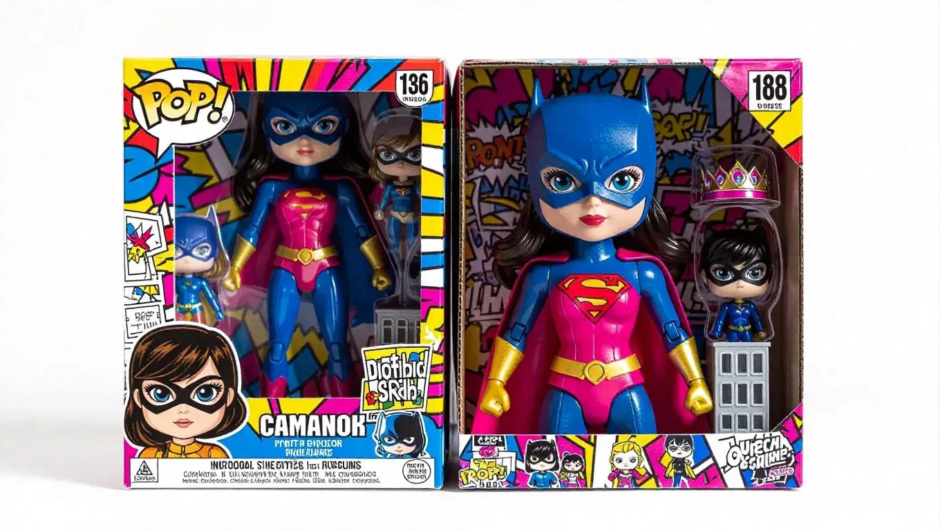 A high-quality product photograph of an action figure box set featuring a superheroine. The action figure is packaged inside a comic book-themed cardboard box with a clear front window. The figure, detailed and slightly stylized, wears a colorful costume and mask. Included are a miniature building, a comic strip, a tiara, and a tiny sidekick. Studio style, clean background, professional lighting, emphasizing the intricate details and premium packaging.