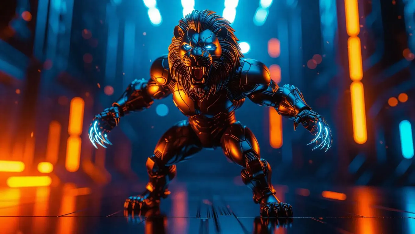 A 1:6 scale superhero lion figure stands in a roaring pose, wearing a bronze nano-suit with shiny plasma claws. The figure's fierce motion is captured with premium box inserts featuring bold motion lines and comic-style effects. Set against a high-energy toy exhibition hall, the scene is illuminated with bright orange and cool blue lights, creating a futuristic and vibrant atmosphere. Style: Hyper-realistic with a touch of comic book flair.