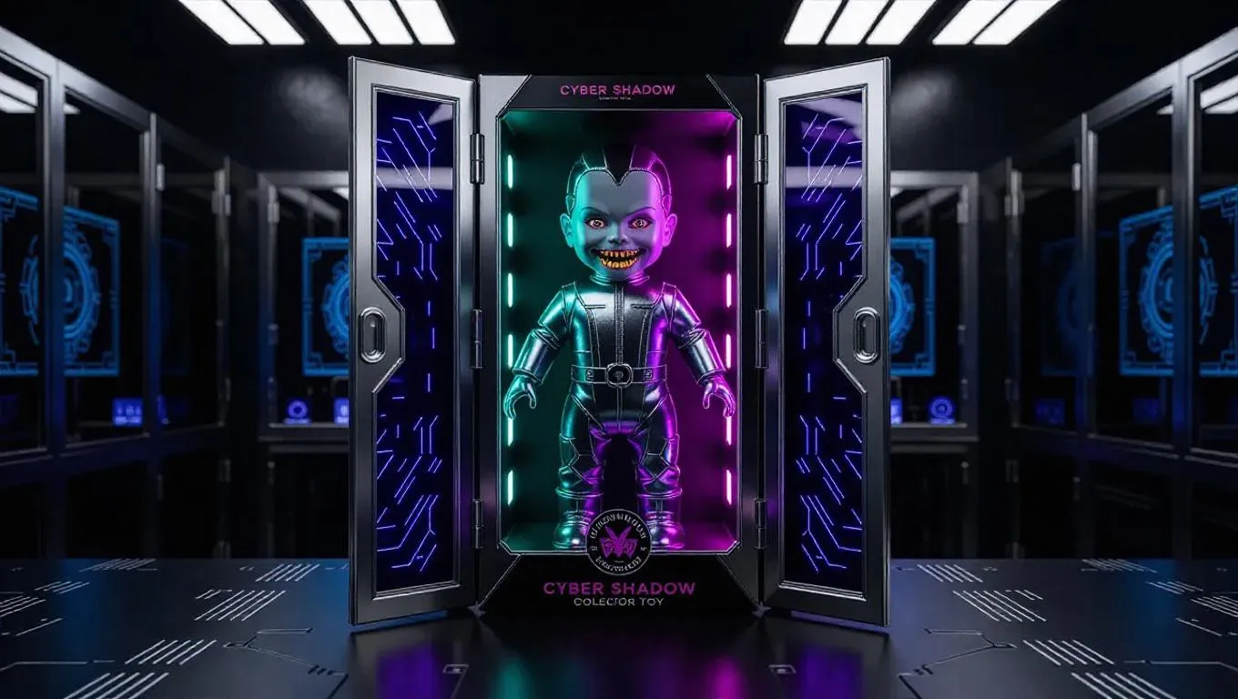 A futuristic vampire doll, a high-tech collector toy, features a metallic jumpsuit, fanged grin, and glowing neon eyes. The doll is displayed in a box with sleek silver-trimmed windows, electric patterns, and a “Cyber Shadow” foil seal. Set against a background of a cutting-edge yet eerie design lab, complete with holographic displays and dark glass panels. Sharp, bright light casts stark shadows, enhancing the doll’s robotic charm. Style: Futuristic fantasy.