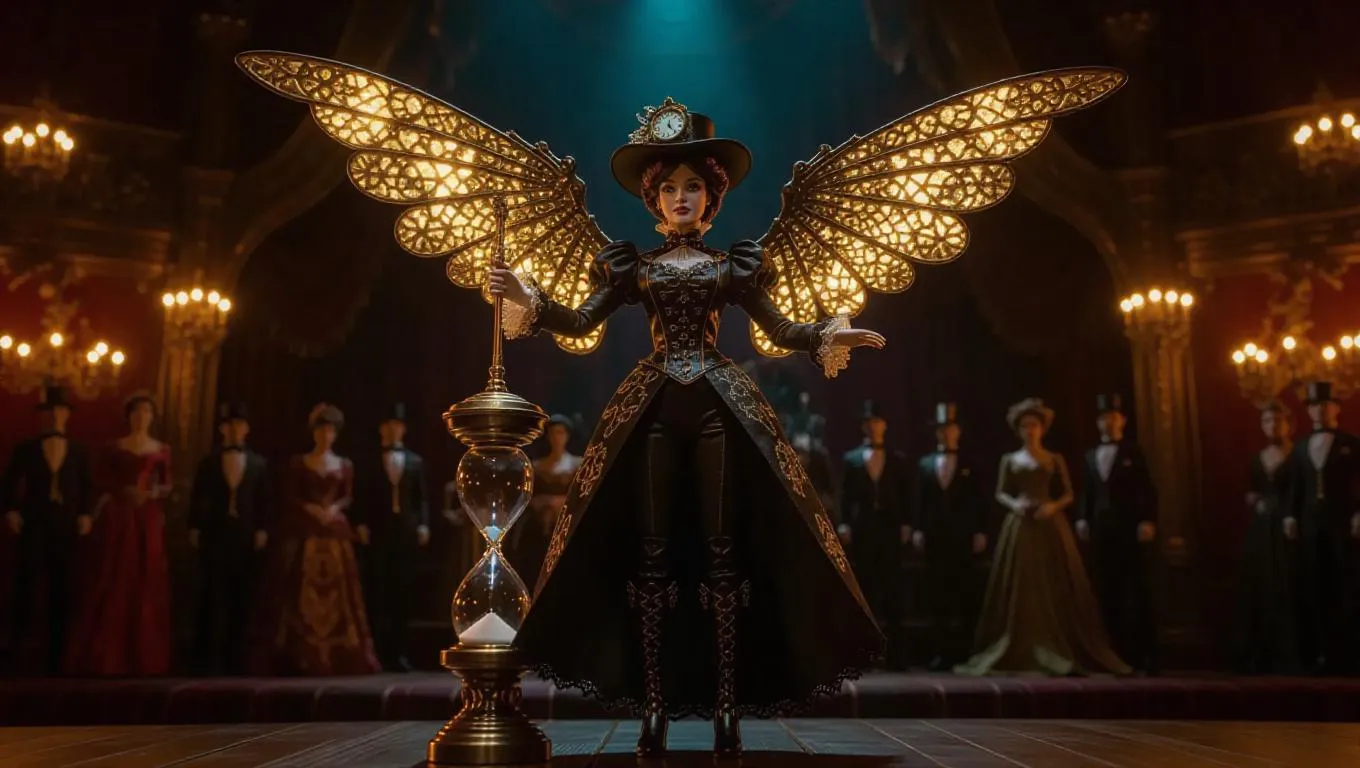 A time traveler action figure with intricate clock-shaped wings and an hourglass staff glowing with radiant golden light. Wears an enchanting outfit adorned with elegant lace. The toy box showcases a Victorian theater design. Background: A lavish stage filled with actors, props, and dramatic lighting. Style: Theatrical.