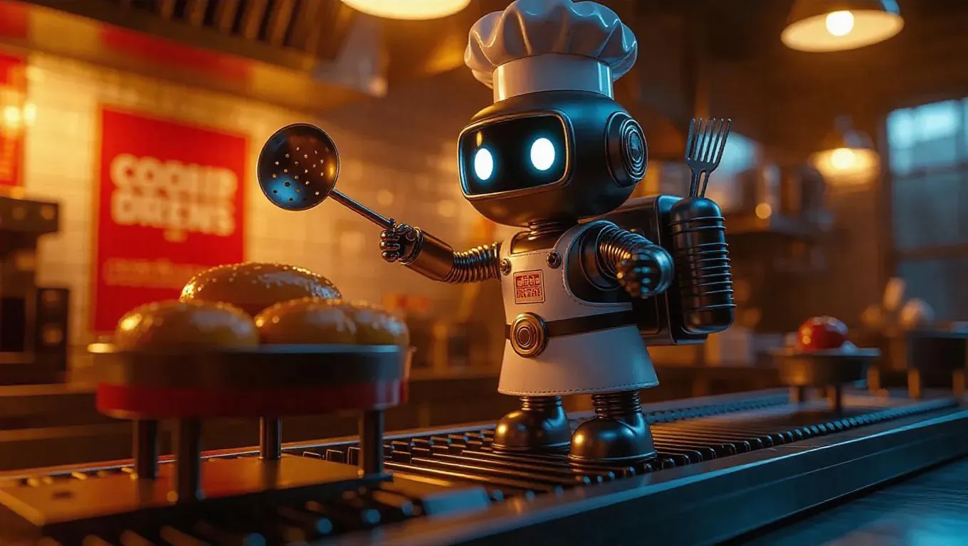 A toy robot chef with ladle arms, a steak-launching backpack, and a garlic sauce sprayer. The robot has a shiny, metallic body with funny, exaggerated features. It stands on a kitchen-style toy conveyor belt system with frying sounds, surrounded by chic diner aesthetics and a holographic bread pattern on the packaging. Soft, diffused lighting highlights the robot's vibrant colors and the dynamic movement of the conveyor belt, creating a warm and inviting atmosphere. Style: Retro-futuristic.