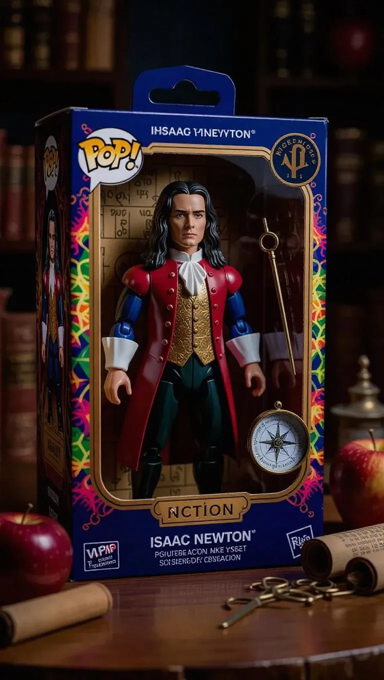 A realistic product photograph of an action figure box set featuring Isaac Newton. The action figure is packaged inside a vibrant science-themed cardboard box with a clear front window. Include relevant assets/accessories such as: a miniature apple, a compass, old scrolls. The figure itself looks detailed, slightly stylized, with his iconic long hair. High-quality lighting, clean background, studio style, product photography