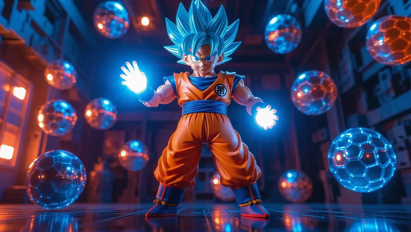 A high-gloss orange and blue robotic Goku mech figure with energy aura hair and a Kamehameha-launching arm stands prominently. The figure's packaging is adorned with dragon ball-themed designs and energy orb-shaped holographic labels, including bonus gear arms. The background showcases an industrial toy factory filled with floating mechanical dragon balls and a gritty, raw atmosphere. Soft, warm light casts gentle highlights on the figure, enhancing its glossy finish. Style: Adorable and futuristic with a touch of cyberpunk flair.