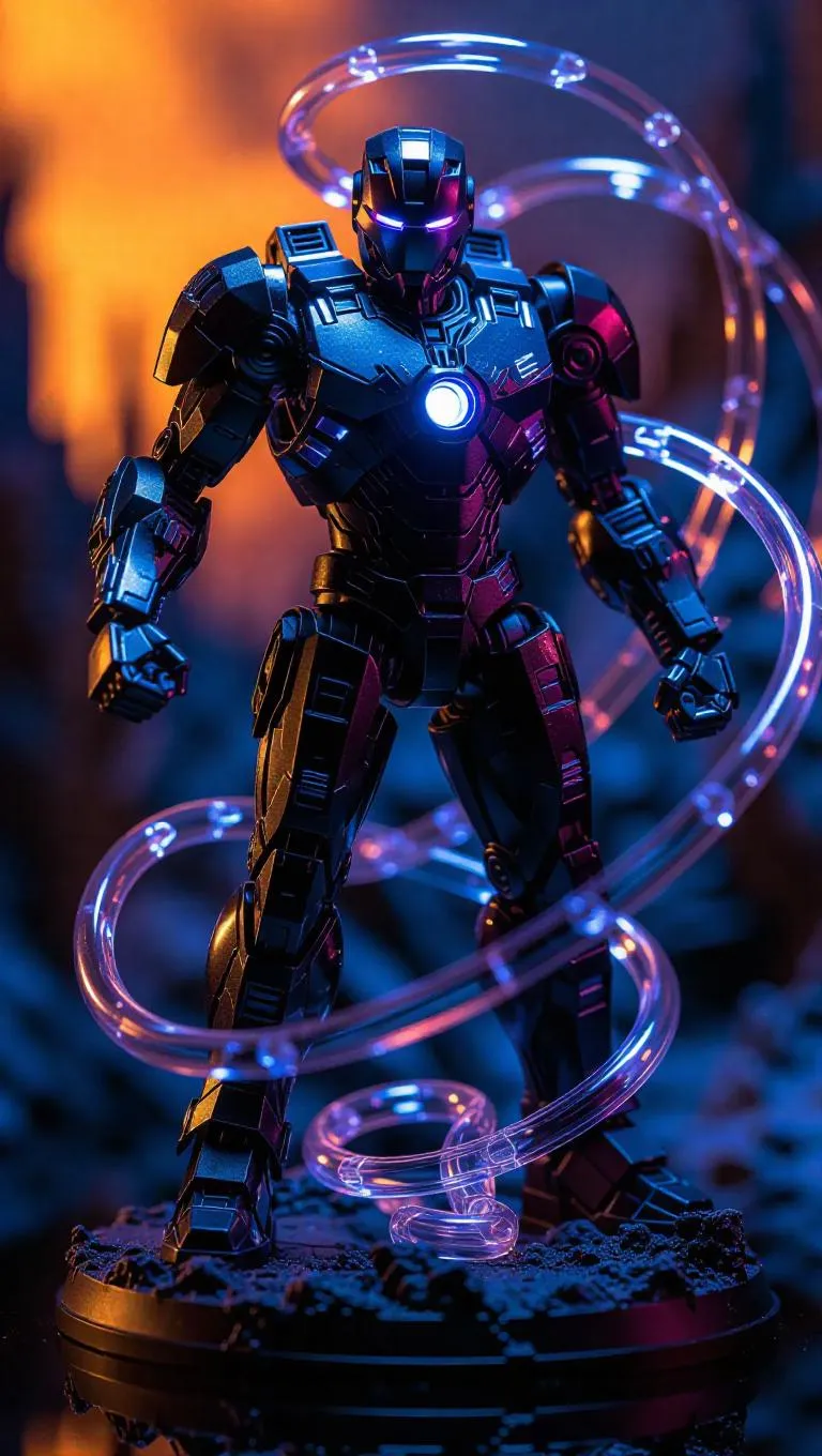 Hyper-detailed toy action figure of a robotic guardian, fusing a plasma cannon with sleek armor plating. Translucent energy waves swirl around the figure, crafted from iridescent resin that shifts colors under varying light. The base showcases a floating, dystopian landscape, capturing the guardian in a dynamic mid-protective pose.