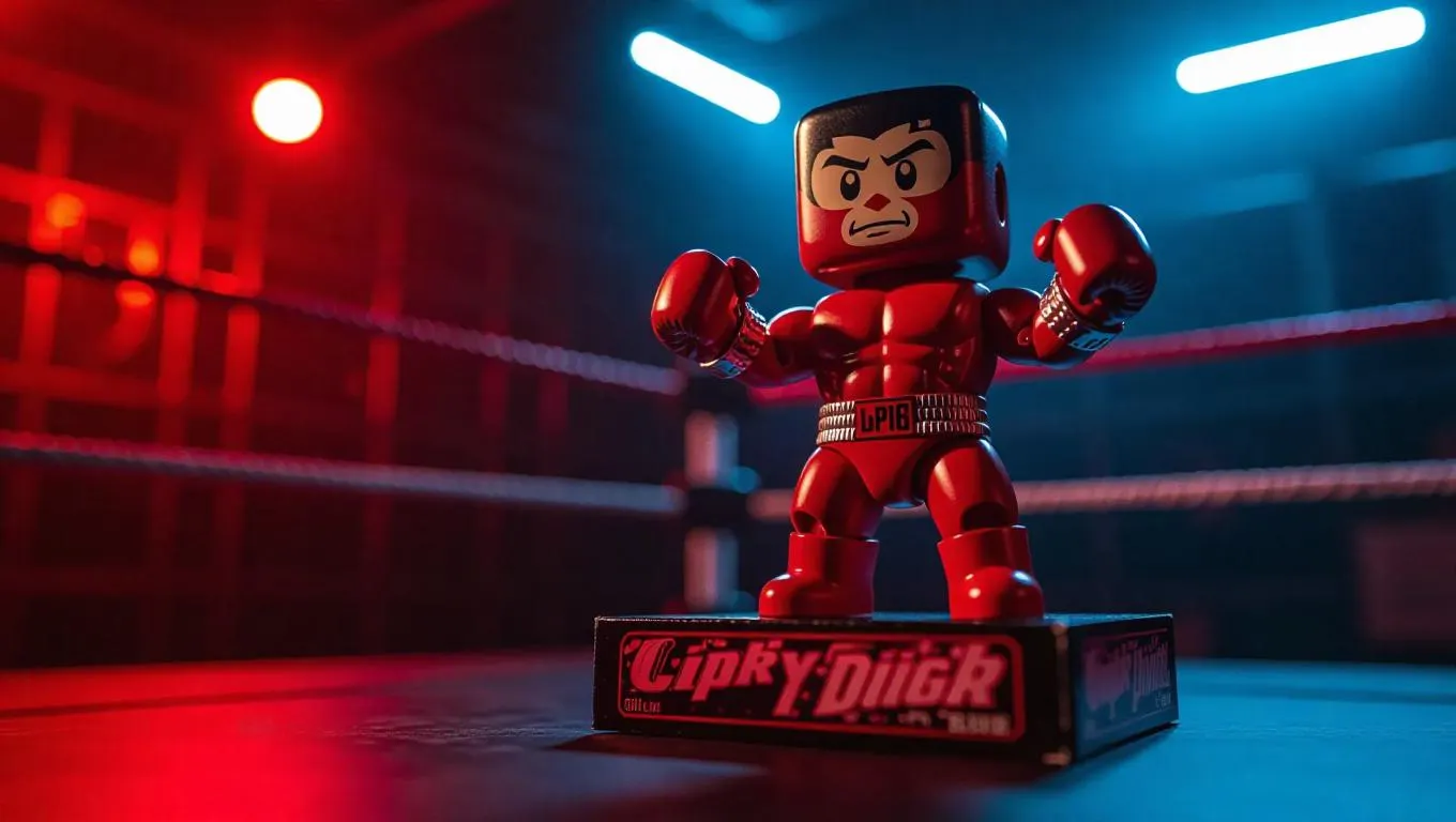 A nostalgic toy boxer with platinum accents poses in a ring platform inside his sports-themed packaging. The box includes a removeable title belt sticker. In an underlit boxing toy factory, red-white spotlight create intense highlights on the canvas, enhancing the dynamic, energetic atmosphere. Realistic sports aesthetics.