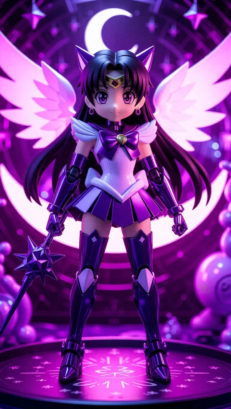 A high-gloss purple and white robotic Sailor Saturn mech figure with crescent moon wings and a shadow-launching wand stands prominently. The packaging is adorned with star-themed designs and crescent moon-shaped holographic labels, featuring bonus gear arms. The background showcases a magical toy factory filled with floating mechanical shadows and a whimsical, celestial atmosphere. Soft, warm light casts gentle highlights, enhancing the figure’s glossy finish. Style: Cute and futuristic with a touch of cyberpunk flair.