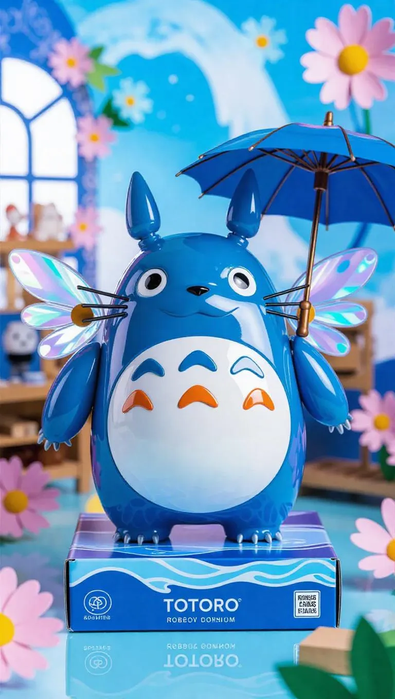 A high-gloss blue and orange robotic Totoro mech figure with flower wings and a snow-launching umbrella stands prominently. The packaging features ocean-themed designs and wave-shaped holographic labels, including bonus gear legs. The background showcases a dreamy toy workshop with floating mechanical flowers and a vibrant, ocean-inspired atmosphere. Soft, cool light casts gentle highlights, enhancing the glossy finish. Style: Adorable and sleek with a touch of steampunk flair.