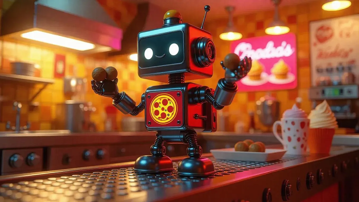 A toy robot chef with pizza cutter arms, a meatball-launching backpack, and a honey sprayer. The robot has a shiny, metallic body with playful, exaggerated features. It stands on a kitchen-style toy conveyor belt system with cooking sounds, surrounded by classic diner designs and a holographic cupcake pattern on the packaging. Soft, bright lighting highlights the robot’s vibrant colors and the dynamic action of the conveyor belt, creating a welcoming and hearty atmosphere. Style: Retro-futuristic.