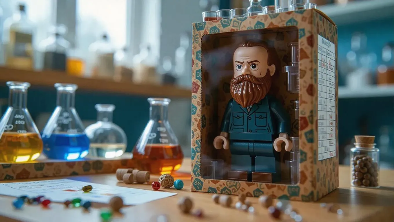 A realistic product photograph of an action figure box set featuring Dmitri Mendeleev. The action figure is packaged inside a chemistry-themed cardboard box with a clear front window. Include relevant assets/accessories such as: periodic table, flasks, workshop notes. The figure itself looks detailed, slightly stylized, with his bushy beard. High-quality lighting, clean background, studio style, product photography