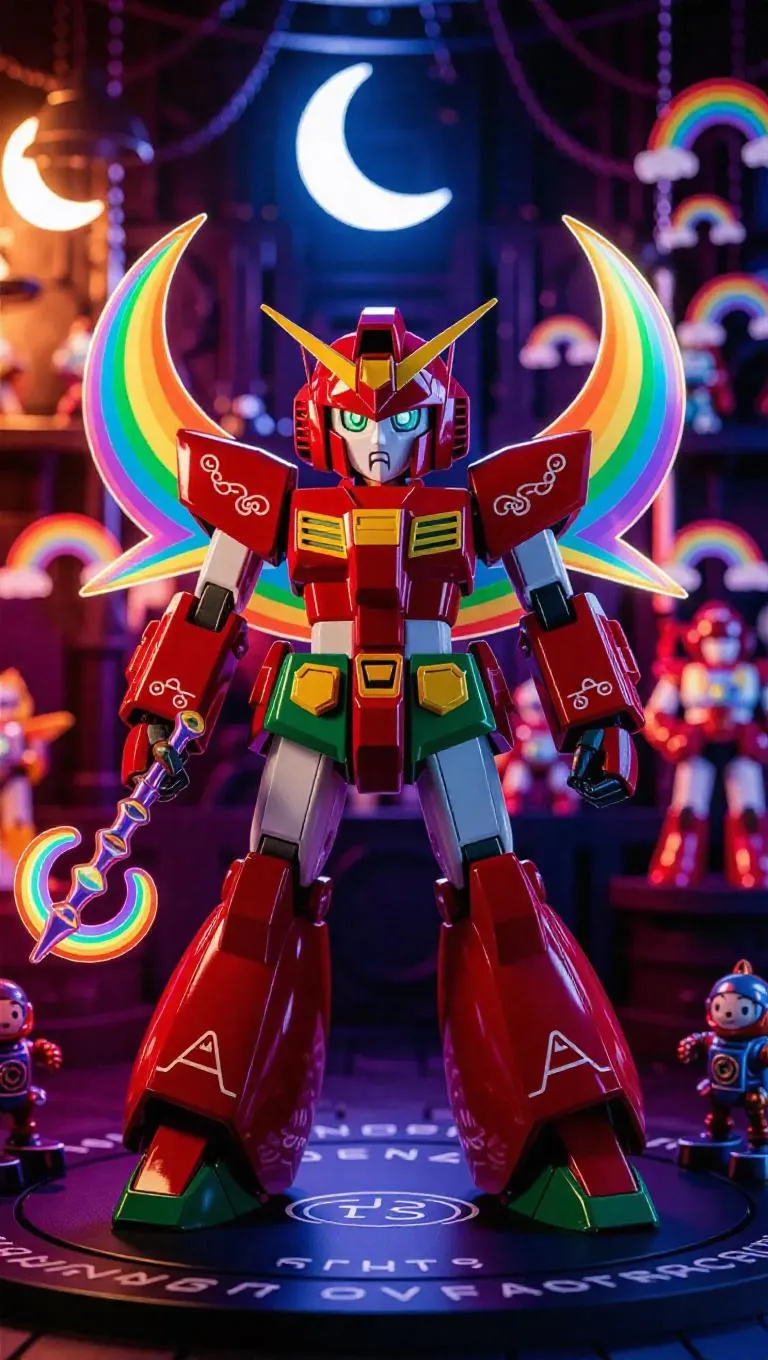 A high-gloss red and green robotic Sailor Rainbow mech figure with crescent moon wings and a color-launching wand stands prominently. The packaging is adorned with rainbow-themed designs and crescent moon-shaped holographic labels, featuring bonus gear arms. The background showcases a magical toy factory filled with floating mechanical rainbows and a whimsical, celestial atmosphere. Soft, warm light casts gentle highlights, enhancing the figure’s glossy finish. Style: Cute and futuristic with a touch of cyberpunk flair.