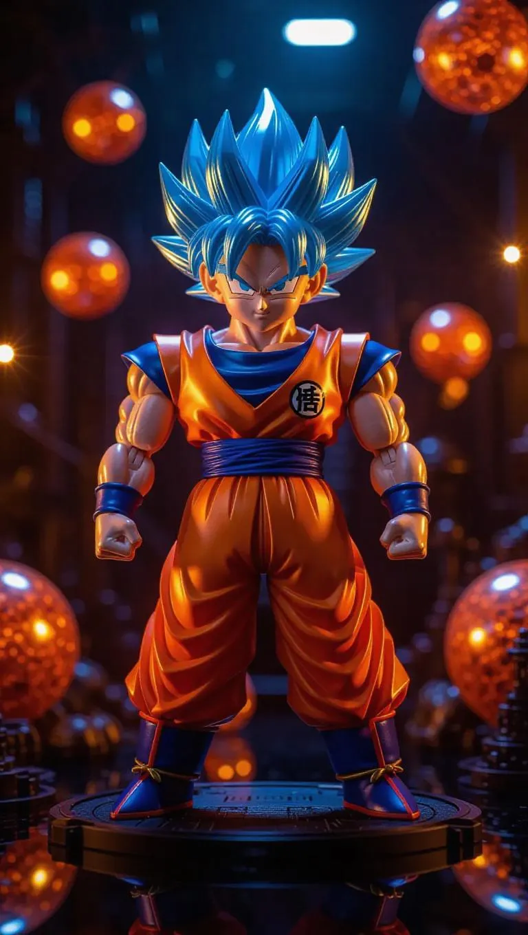 A high-gloss orange and blue robotic Goku mech figure with energy aura hair and a Kamehameha-launching arm stands firmly. The figure's packaging is adorned with dragon ball-themed designs and energy orb-shaped holographic labels, including bonus gear arms. The background showcases a fantastical toy factory filled with floating mechanical dragon balls and a magical, enchanting atmosphere. Soft, warm light casts gentle highlights on the figure, enhancing its glossy finish. Style: Adorable and futuristic with a touch of cyberpunk flair.