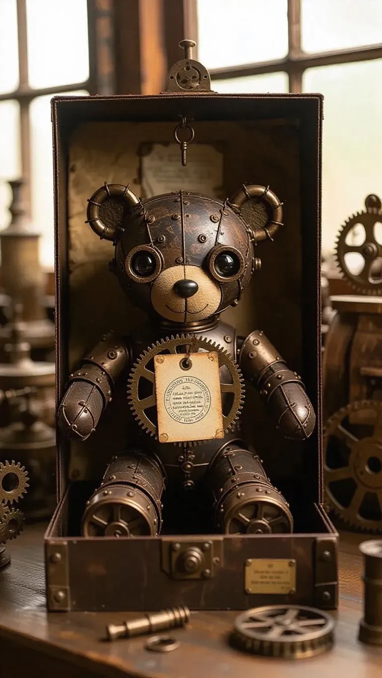 A steampunk teddy bear toy designed from iron scraps, fabric straps, and lens eyes, featuring a winding key on its back. It stands in a collector’s box with aged textures, a faux-canvas label, and a copper window frame. The scene is set inside a vintage toy workshop, surrounded by designs and instruments. Soft, amber light filters through the windows, casting light shadows and accentuating the intricate details of the bear and the workshop. The style is realistic, showcasing the tactile and mechanical elements.