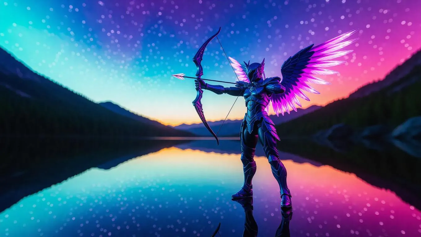 A celestial archer action figure with radiant star-shaped wings and a bow emitting cosmic energy, clad in an outfit adorned with zodiac symbols. Toy box features a vibrant auroral sky design. Background: A serene lake with reflections of the stars and surrounding hills. Style: Hyper-realistic with a tranquil fantasy twist.